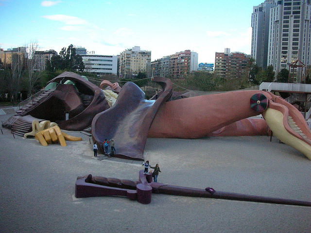 When the river Turia flooded in 1957 and devastated much of Valencia, the authorities decided to divert it around the city, and the original river bed dried up. This was transformed into an amazing park which meanders through the centre of the city, and features gardens, cafés, sports fields, sculptures – and the Gulliver Park, a children’s adventure playground centred on a massive climbable fibreglass model of Lemuel Gulliver tied to the ground with ropes!